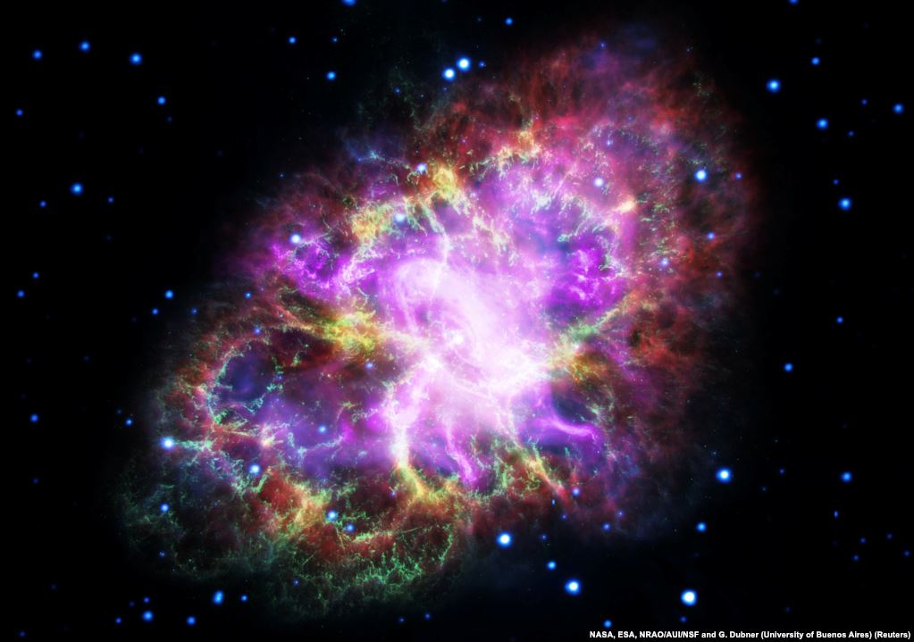 این تصویری است که از ترکیب دادههای پنج تلکسوپ فضایی از سحابی خرچنگ، که باقی مانده یک ابرنواختر (سوپرنوا) است، ساخته شده است.